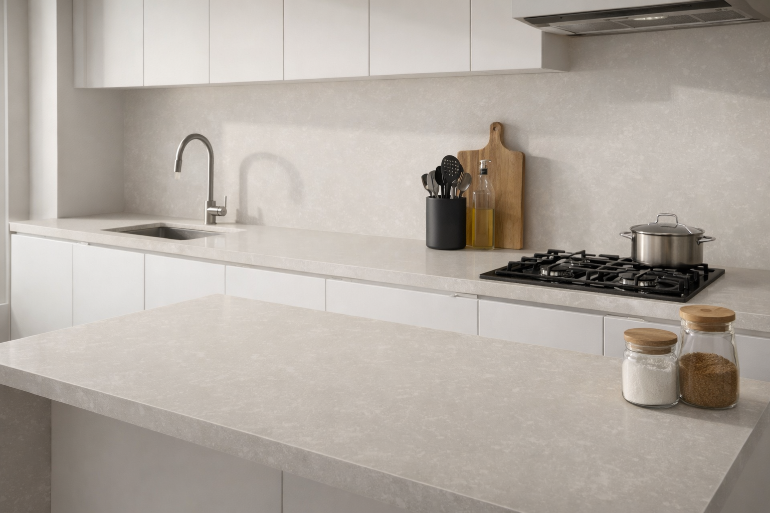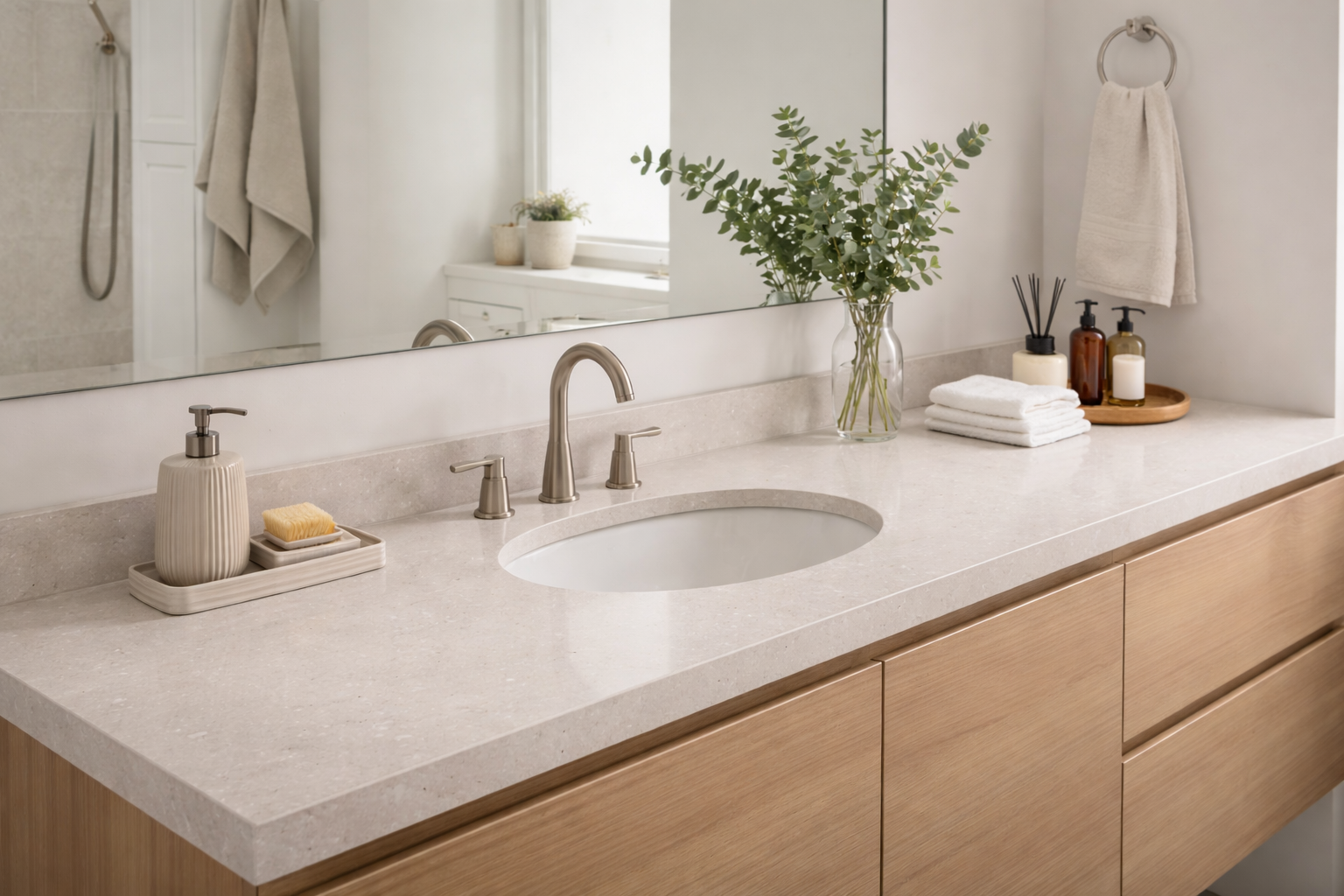 Oxide presents a warm beige surface accented with delicate white veining and subtle mineral-like textures. Its soft tonal movement creates a natural, grounded appearance that works beautifully in both modern and classic interiors. Offered in polished and leather finishes with a durable 3cm thickness and a versatile 130x65 slab size, Oxide delivers understated sophistication for countertops, vanities, and architectural surfaces.