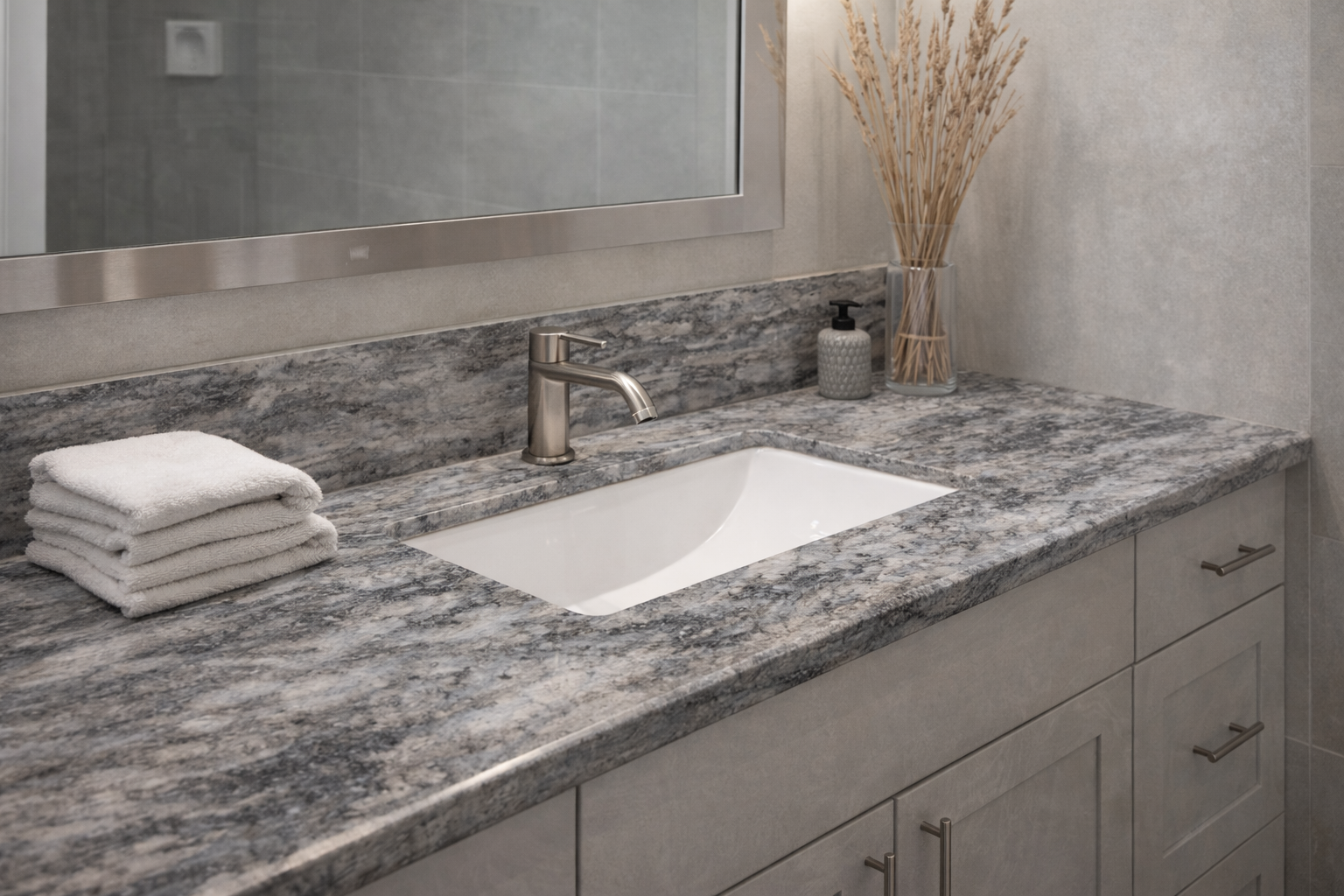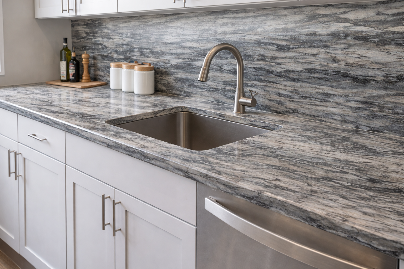 Ruskin features a deep blue foundation layered with sweeping grey veining that moves naturally across the surface, creating a rich and dimensional appearance. The horizontal movement of color evokes natural stone formations, while the polished finish enhances its depth and clarity. Designed in a durable 3cm thickness and a generous 137x79 slab size, Ruskin brings a bold yet refined presence to kitchens, islands, and statement surfaces where texture and movement are desired.